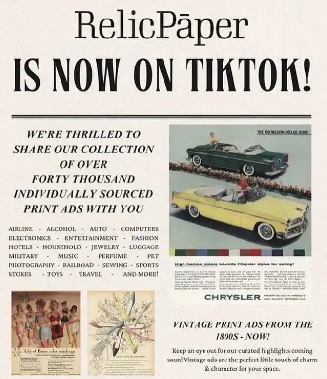“RelicPaper helped me find the perfect vintage ad for my collection. Their selection is unmatched, and their service is exceptional!”