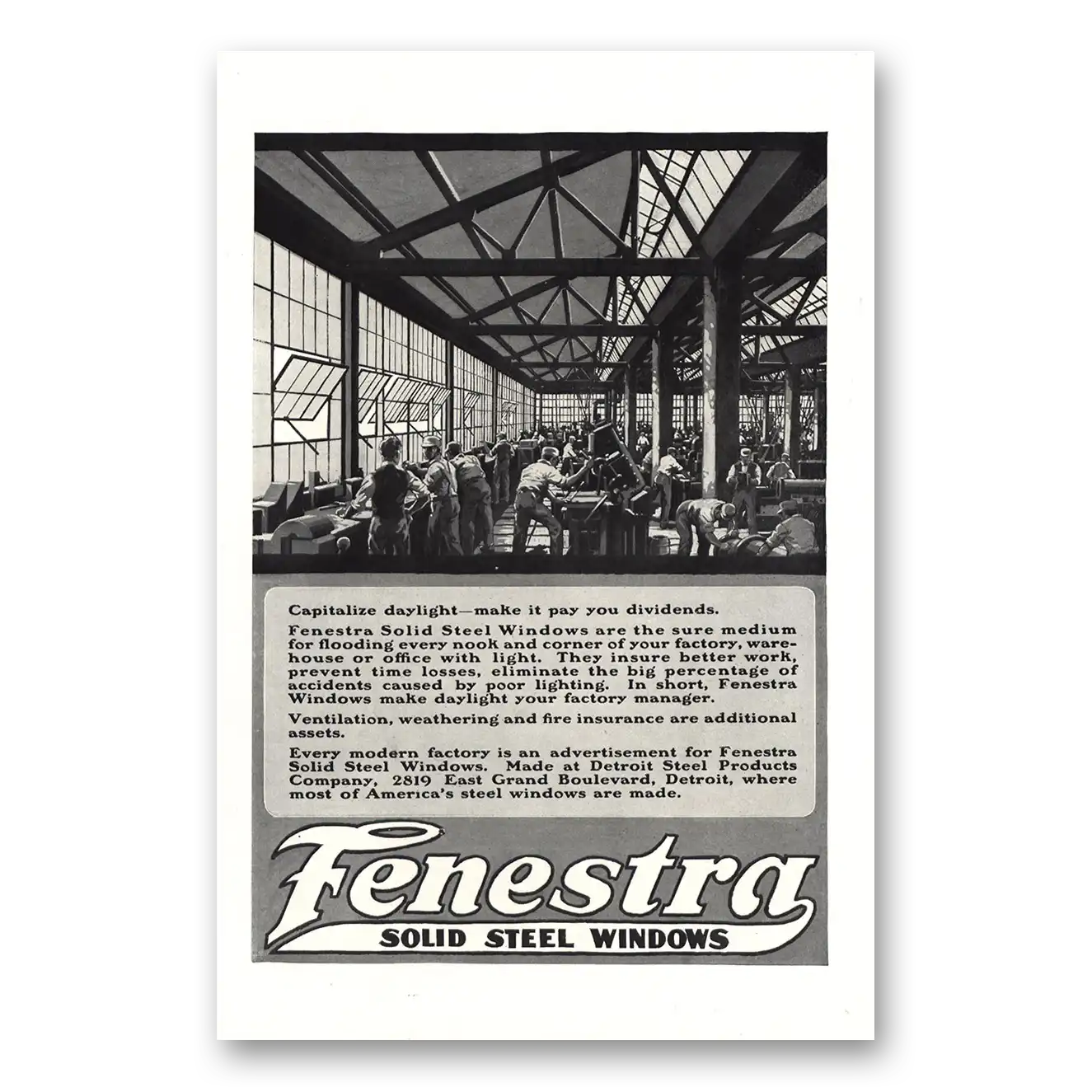 This is an original 1918 Fenestra Solid Steel Windows print ad published by Detroit Steel Products.
