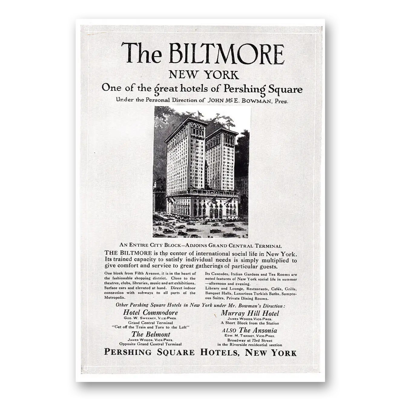 1920 Biltmore Hotel Print Ad | Pershing Square