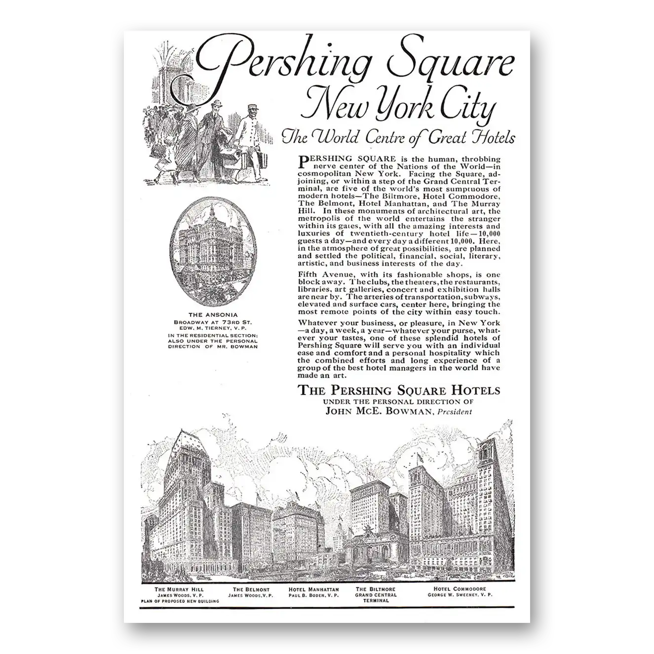This is an original 1920 Pershing Square Hotels print ad published by Pershing Square Hotels.