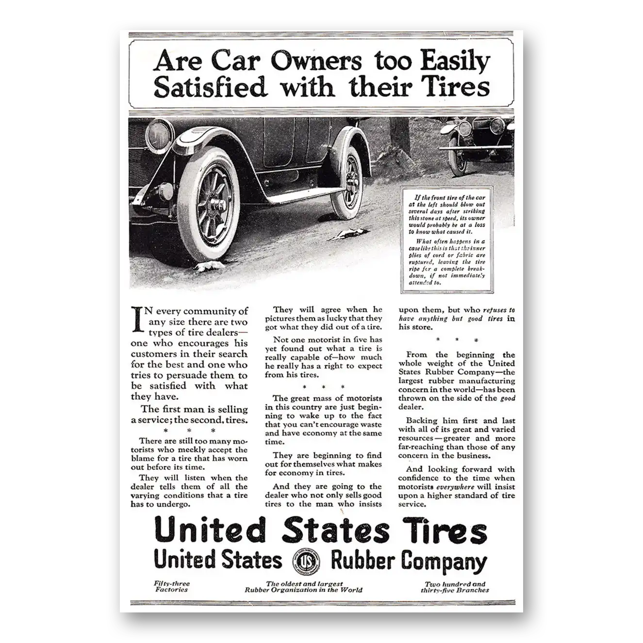 1920 US Tires Print Ad | Satisfied
