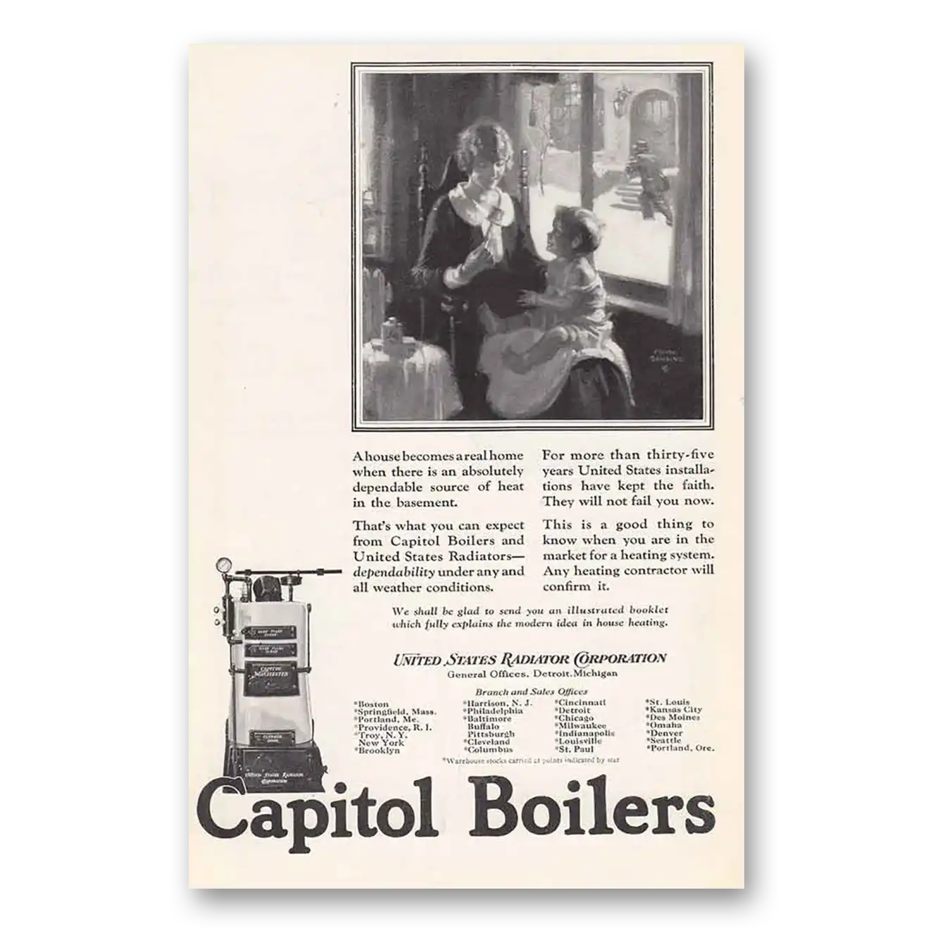 This is an original 1925 Capitol Boilers print ad published by United States Radiator Corp.
