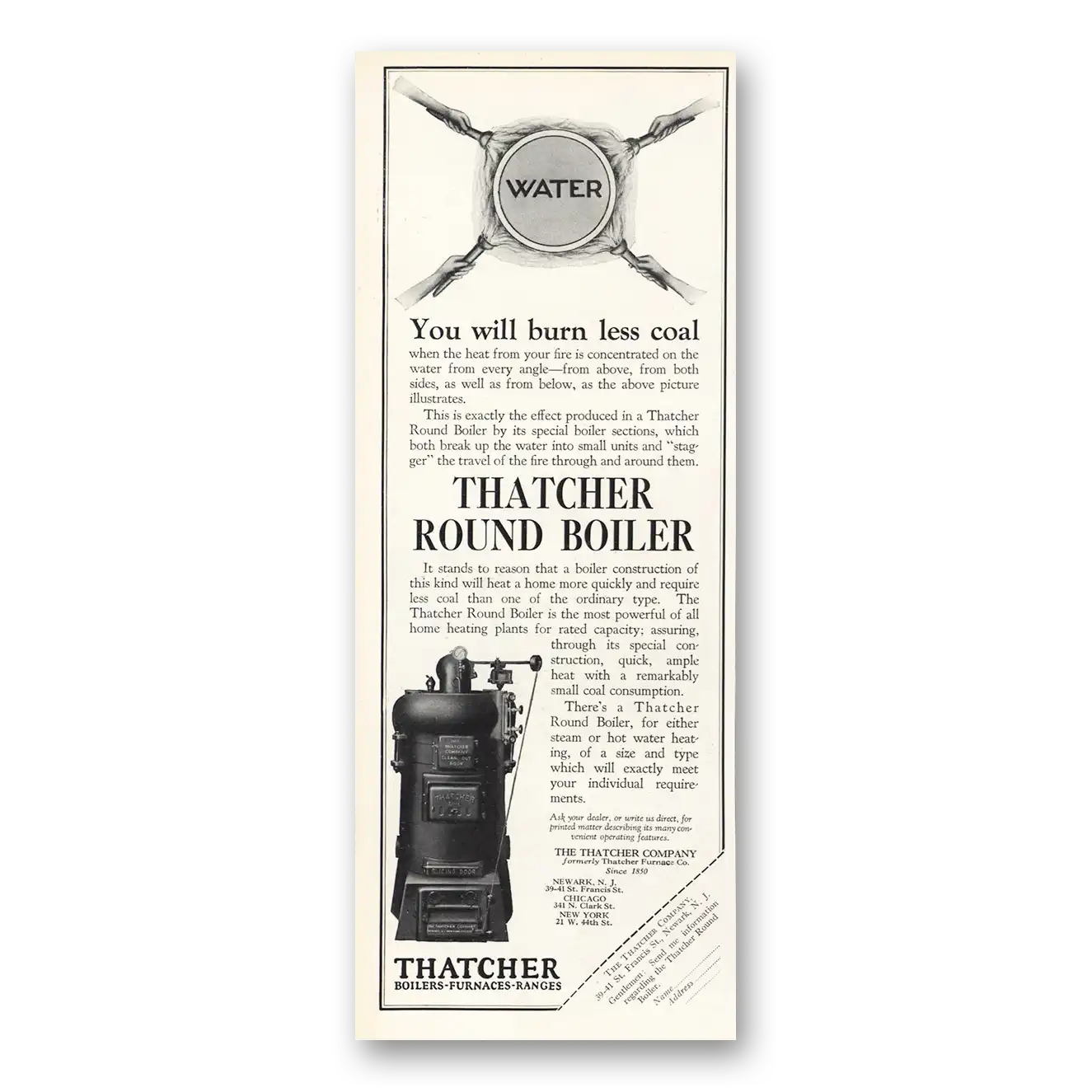 1926 Thatcher Round Boiler Print Ad | Burn Less Coal1926 Thatcher Round Boiler Print Ad | Burn Less Coal