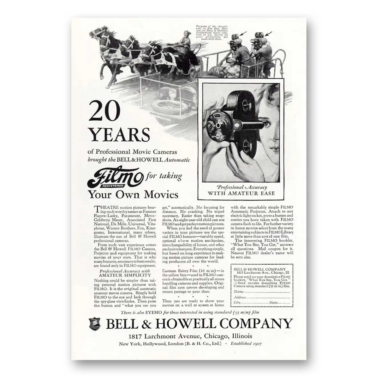 1927 Filmo Camera Print Ad | Chariot Race