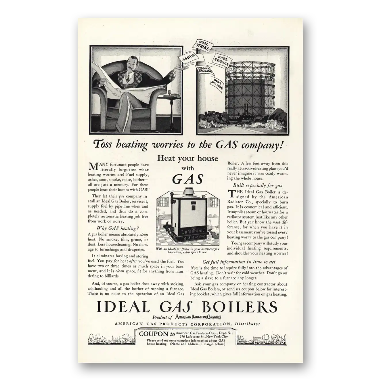 This is an original 1927 Ideal Gas Boilers print ad published by American Radiator.