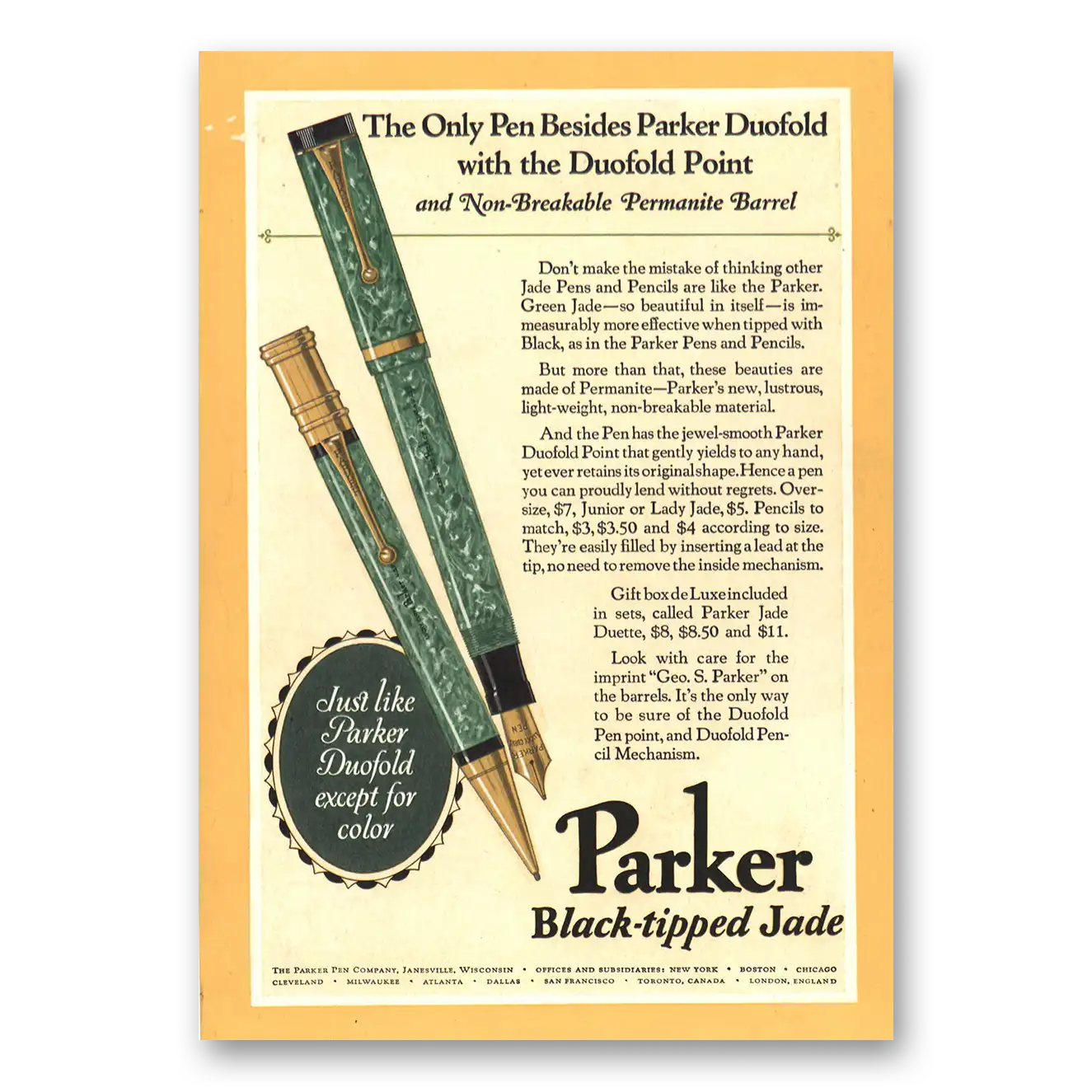 This is an original 1927 Parker Duofold Pen print ad published by Parker Pens.