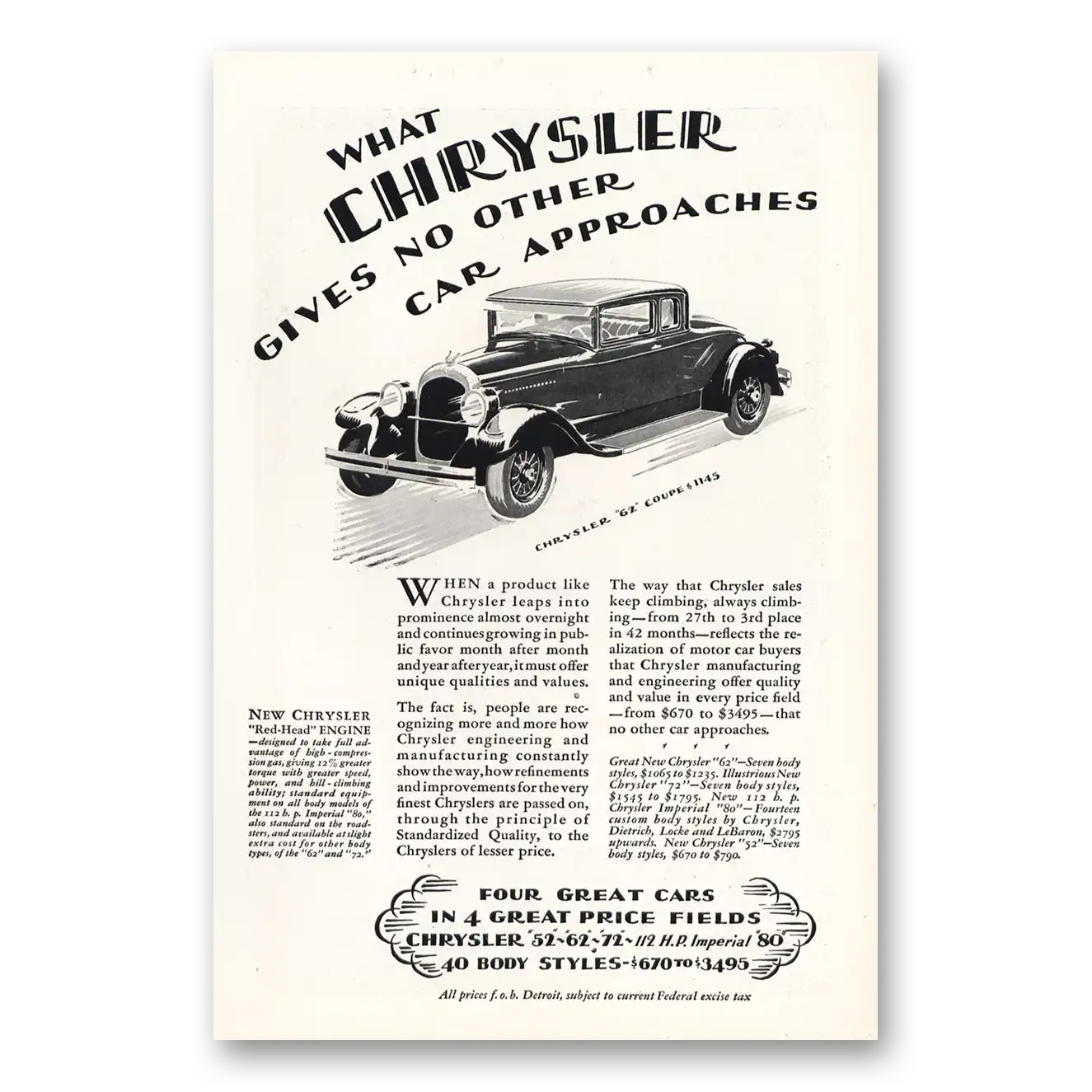 1928 Chrysler 62 Coupe Print Ad | Car Approaches