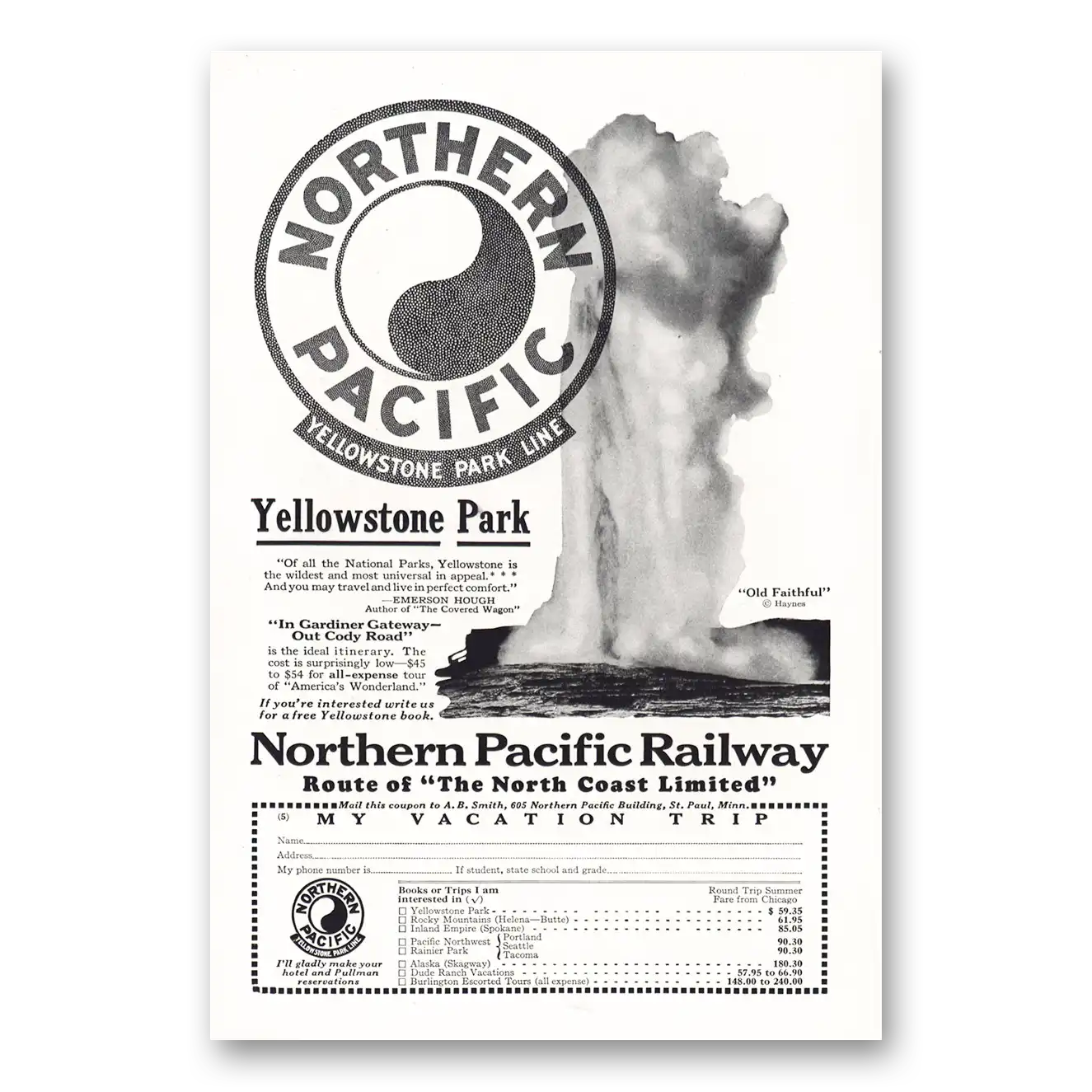1928 Northern Pacific Railway Print Ad | Yellowstone Park