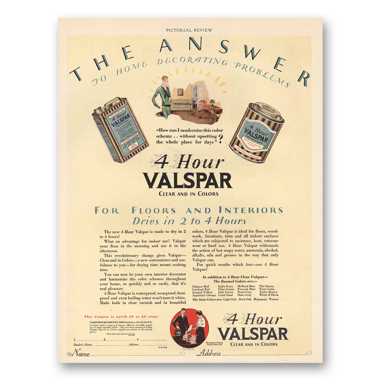 This is an original 1928 Valspar Finishes print ad published by Valentine & Company.