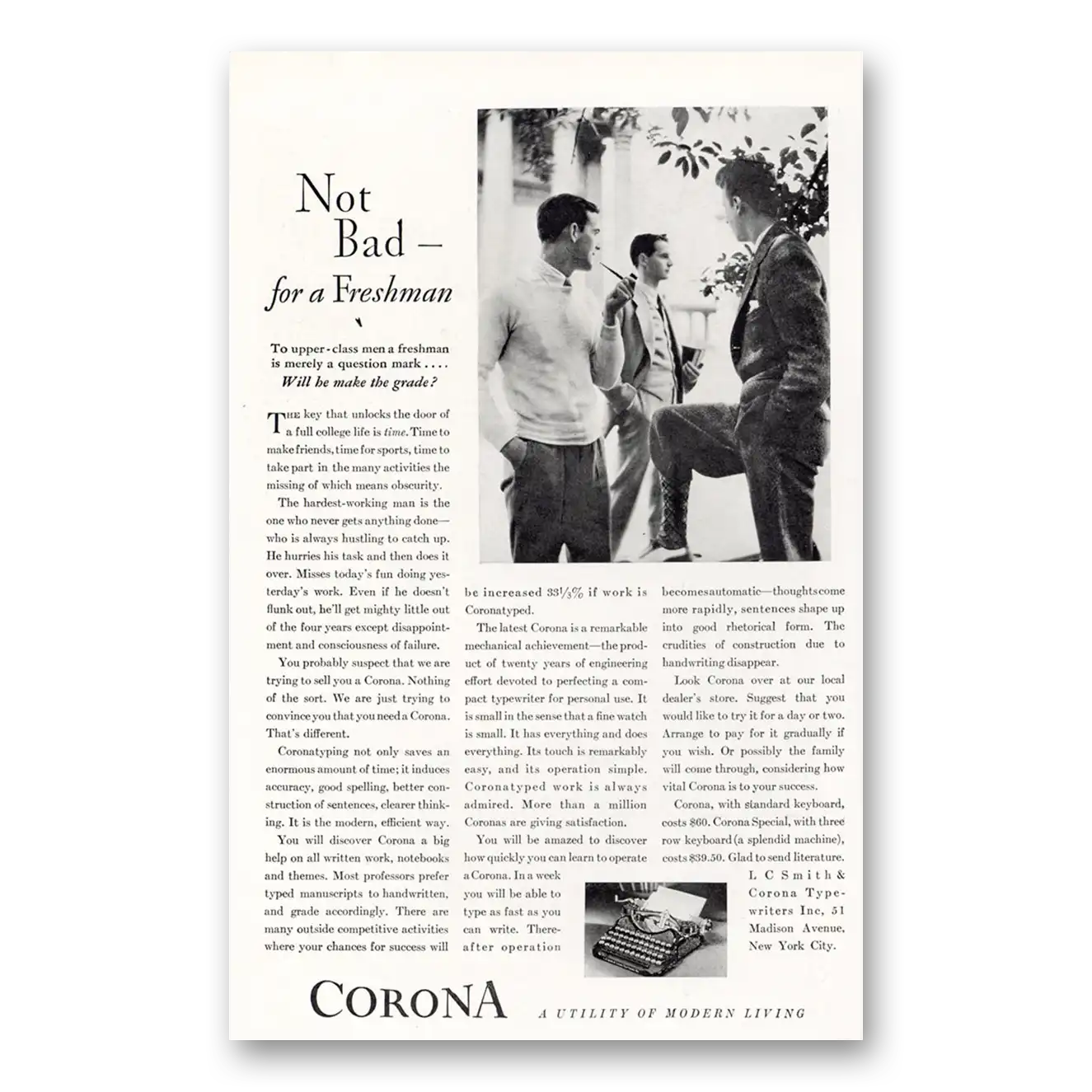 1929 Corona Typewriter Print Ad | Going To College