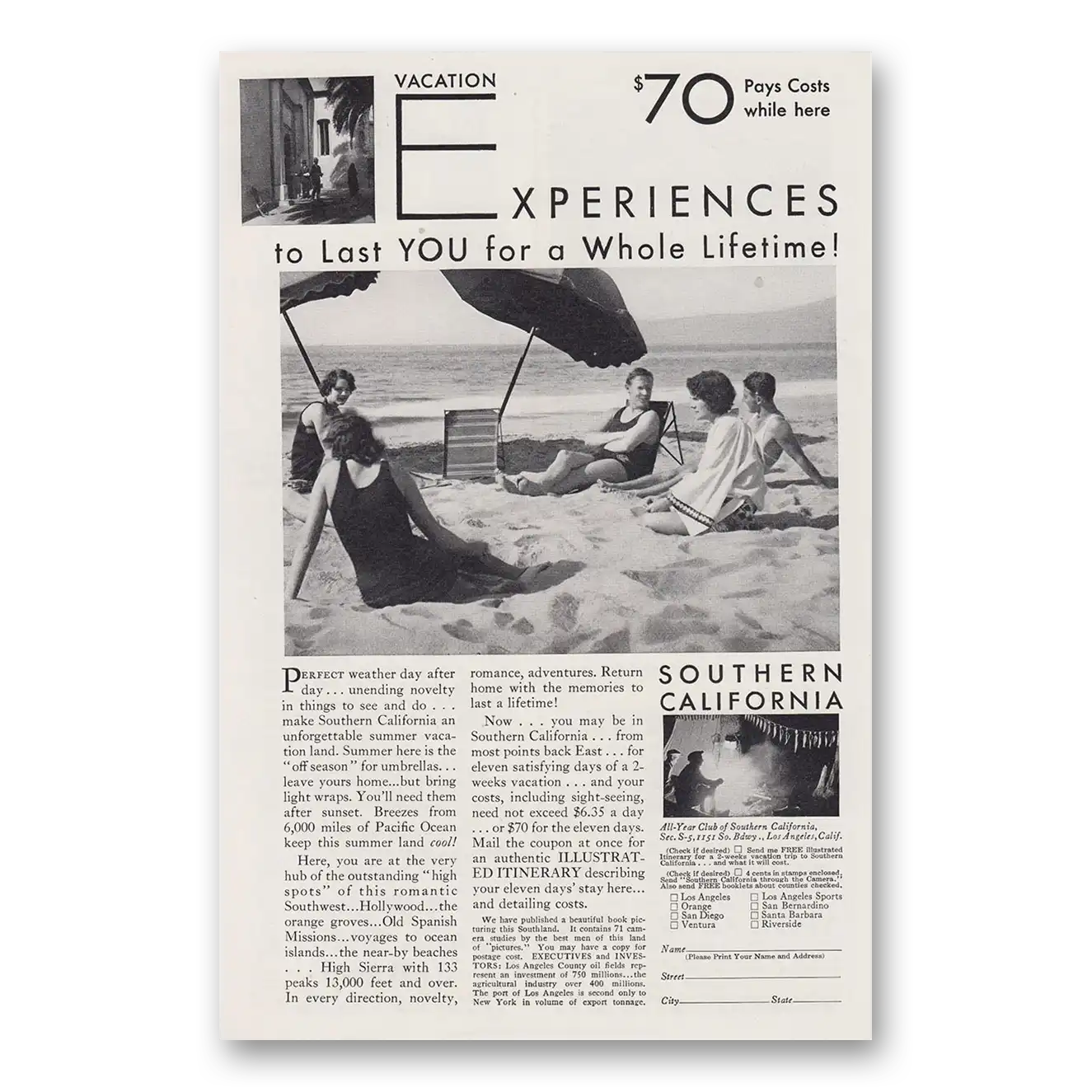 This is an original 1930 Southern California print ad published by Southern California Tourism.