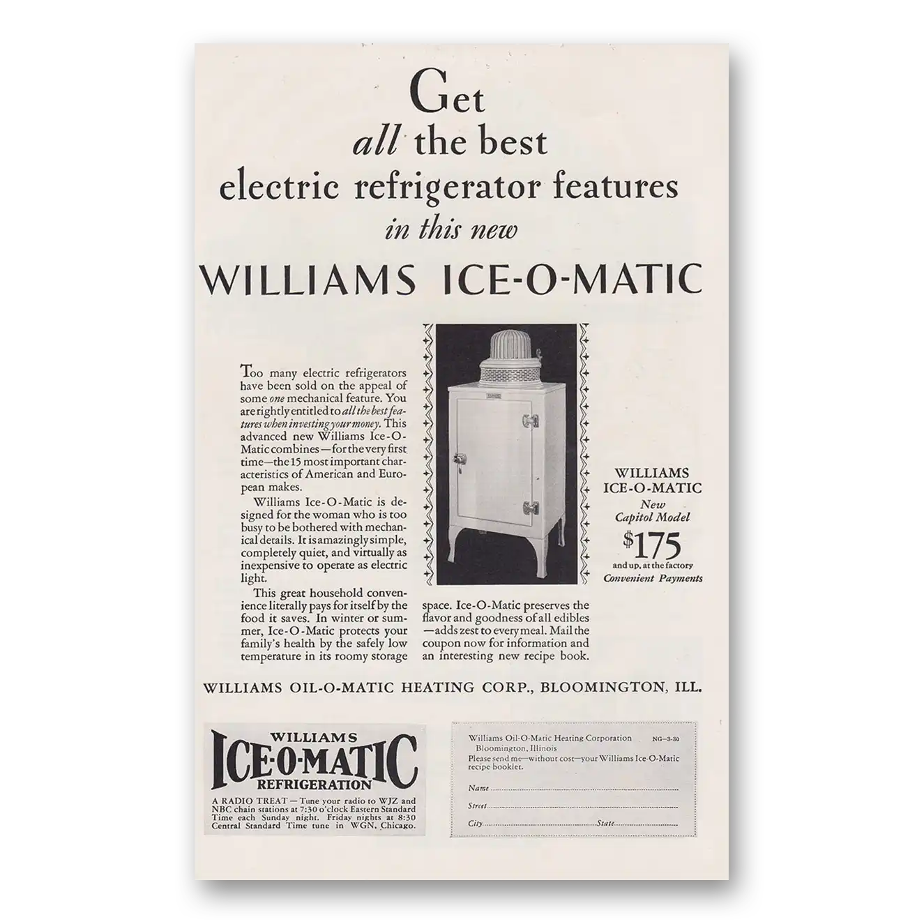 1930 Williams Oil-O-Matic Print Ad | Electric Refrigerator