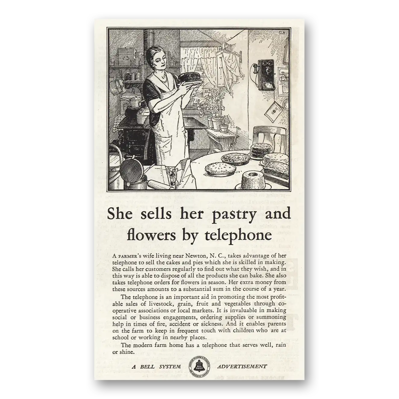 1931 Bell Telephone Print Ad | Sells Her Pastry And Flowers