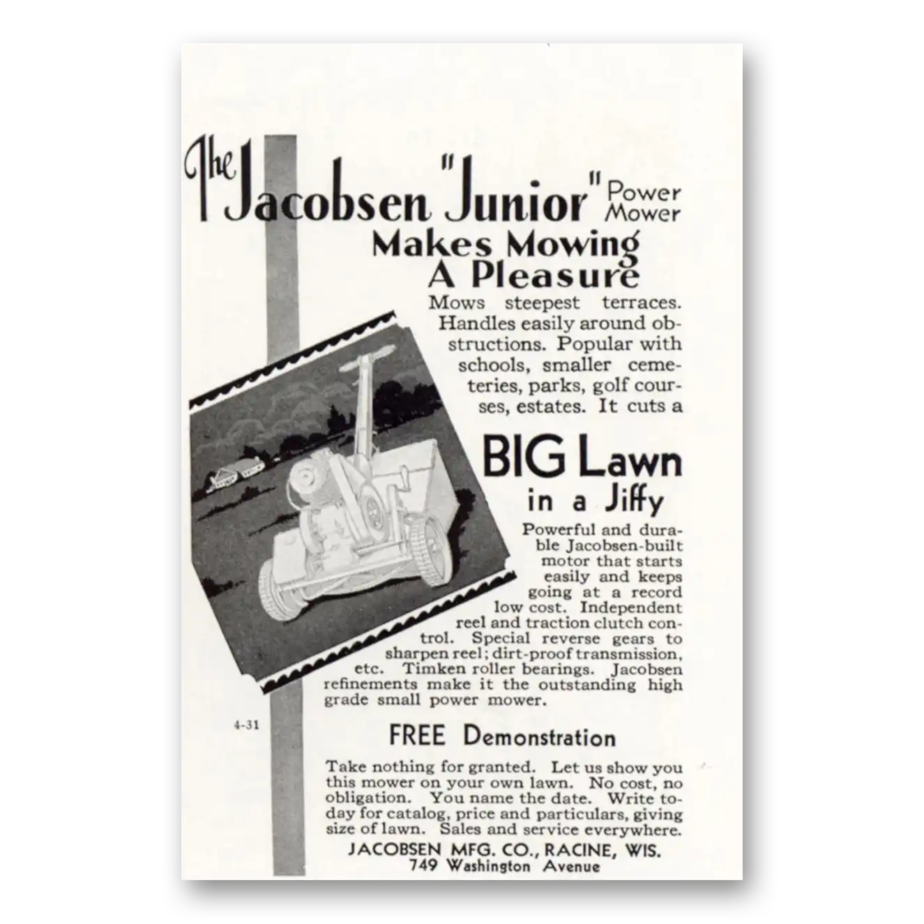 This is an original 1931 Jacobsen Mowers print ad published by Jacobsen.
