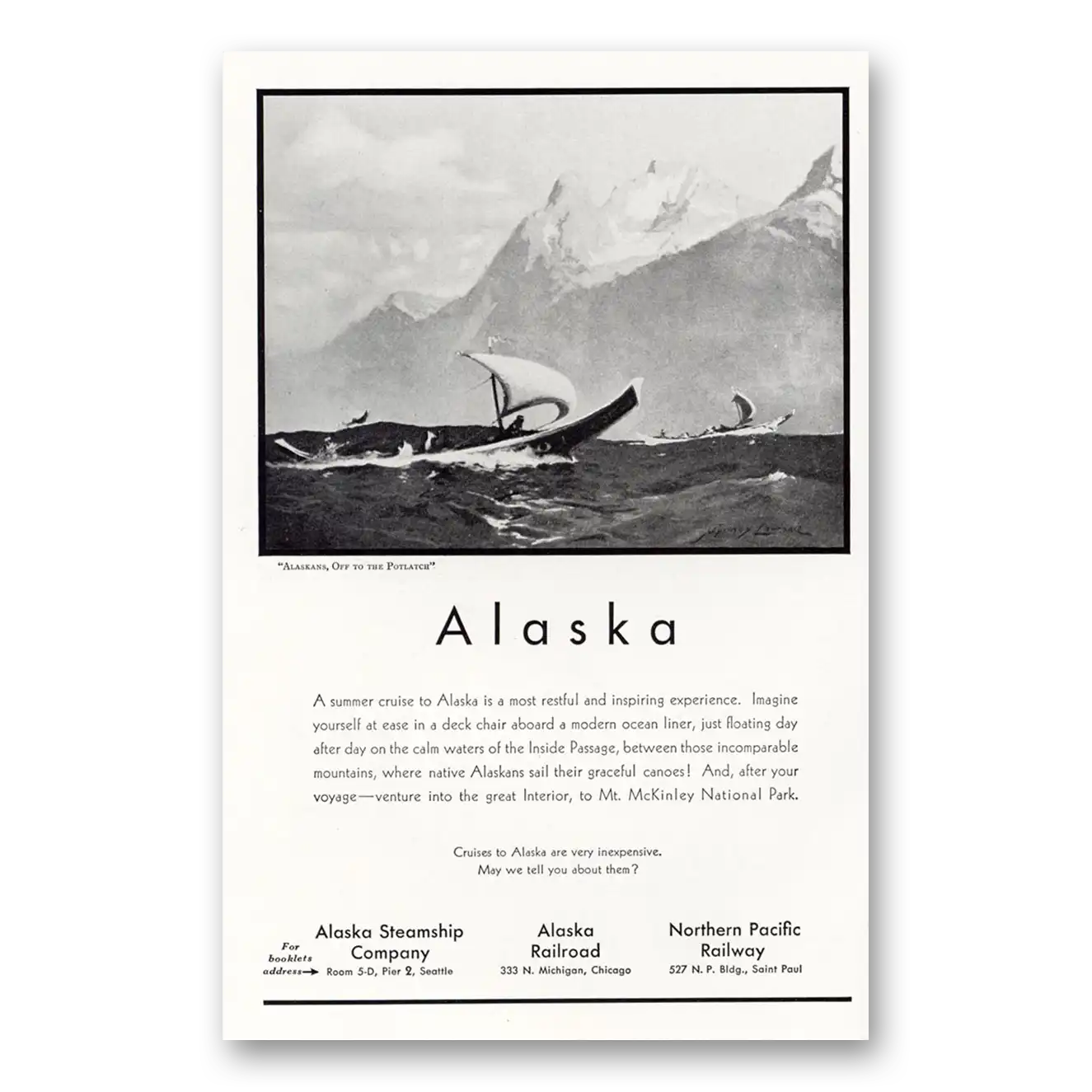 This is an original 1932 Alaska print ad published by Alaska Tourism.