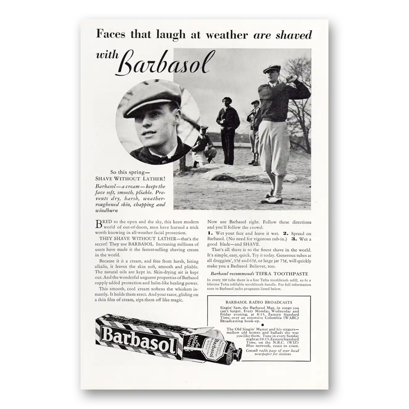 This is an original 1932 Barbasol Shaving Cream print ad published by Barbasol.