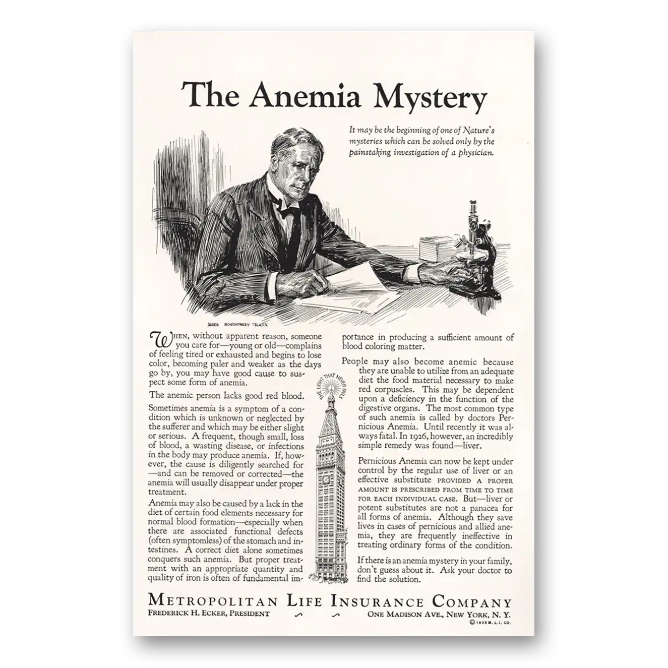1933 Metropolitan Life Insurance Print Ad | Anemia Mystery