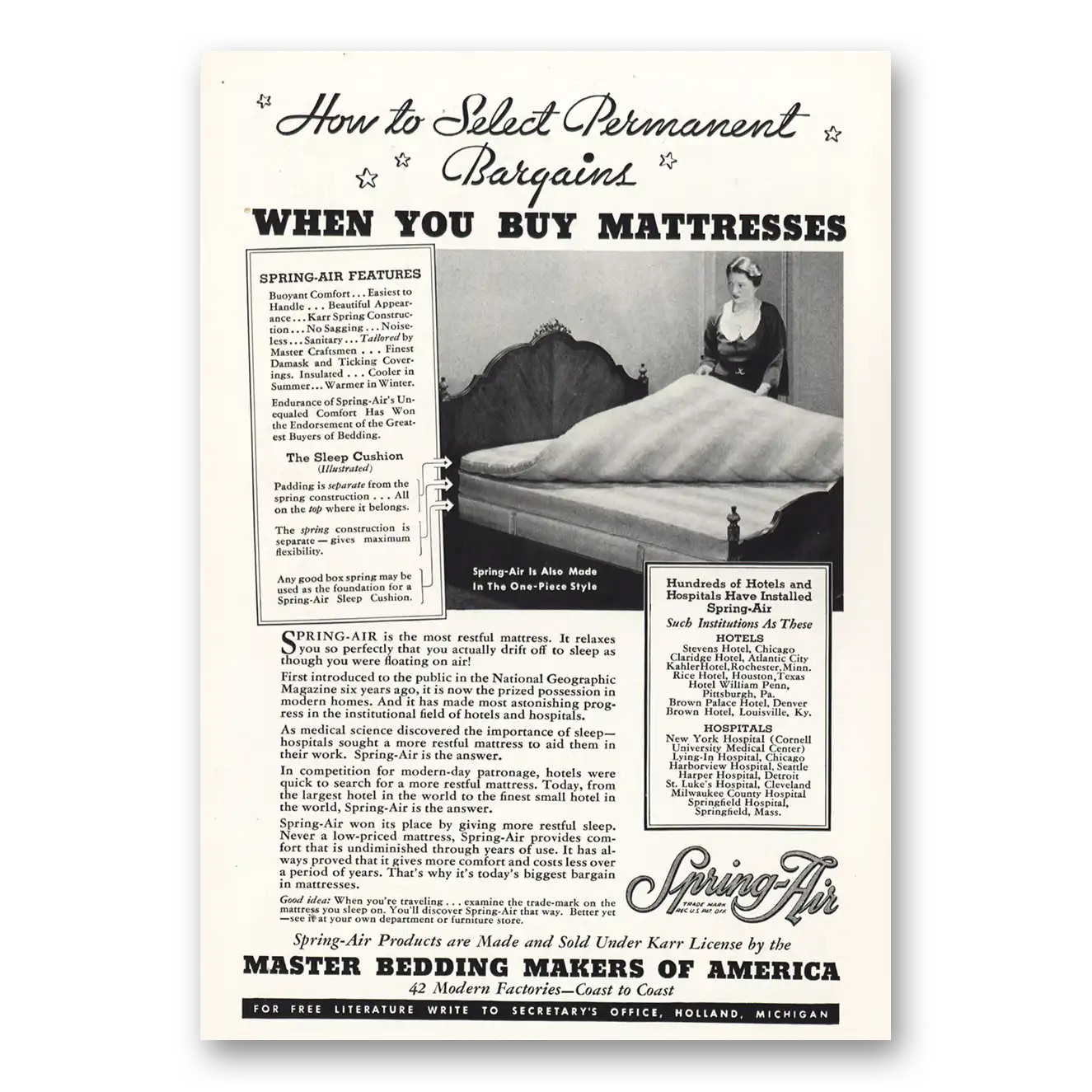 1935 Spring Air Mattress Print Ad | Permanent Bargains