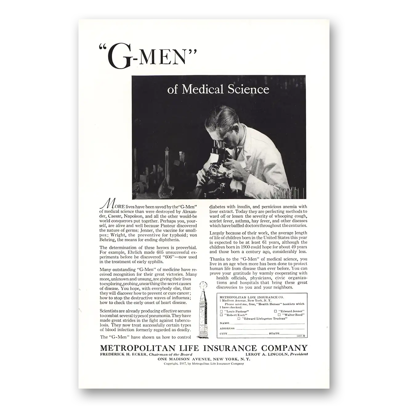 1937 Metropolitan Life Insurance Print Ad | G Men