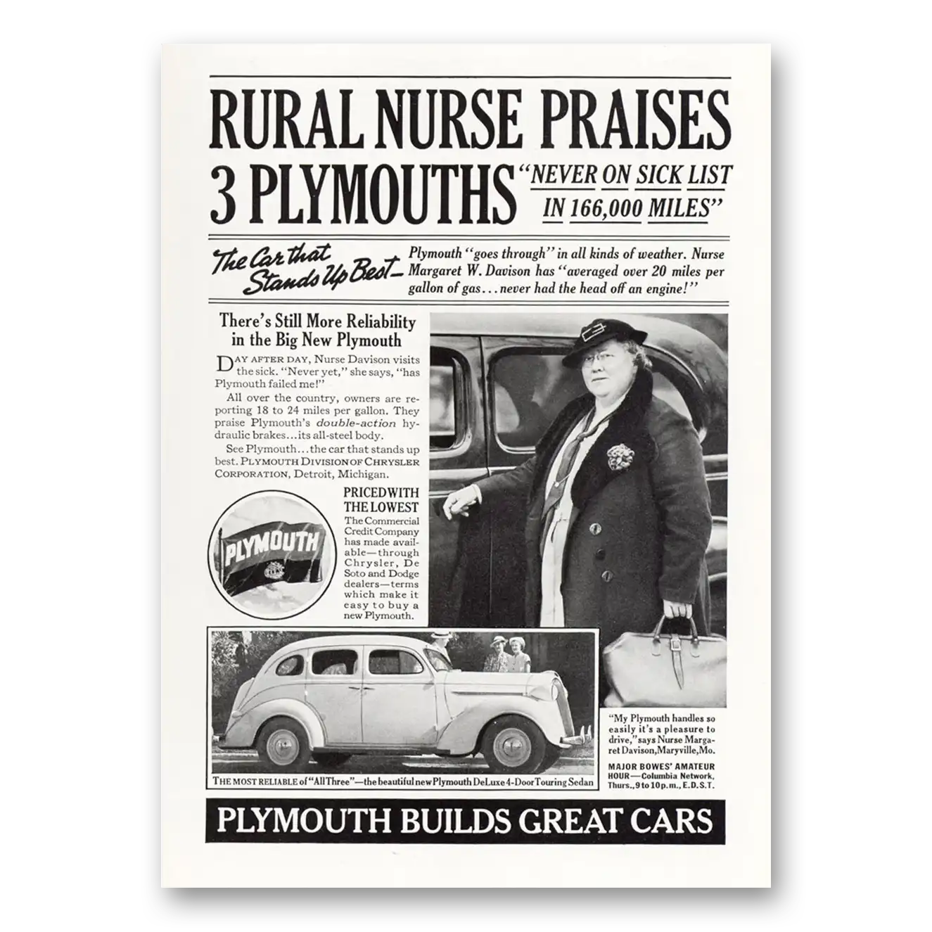 1937 Plymouth Touring Sedan Print Ad | Rural Nurse