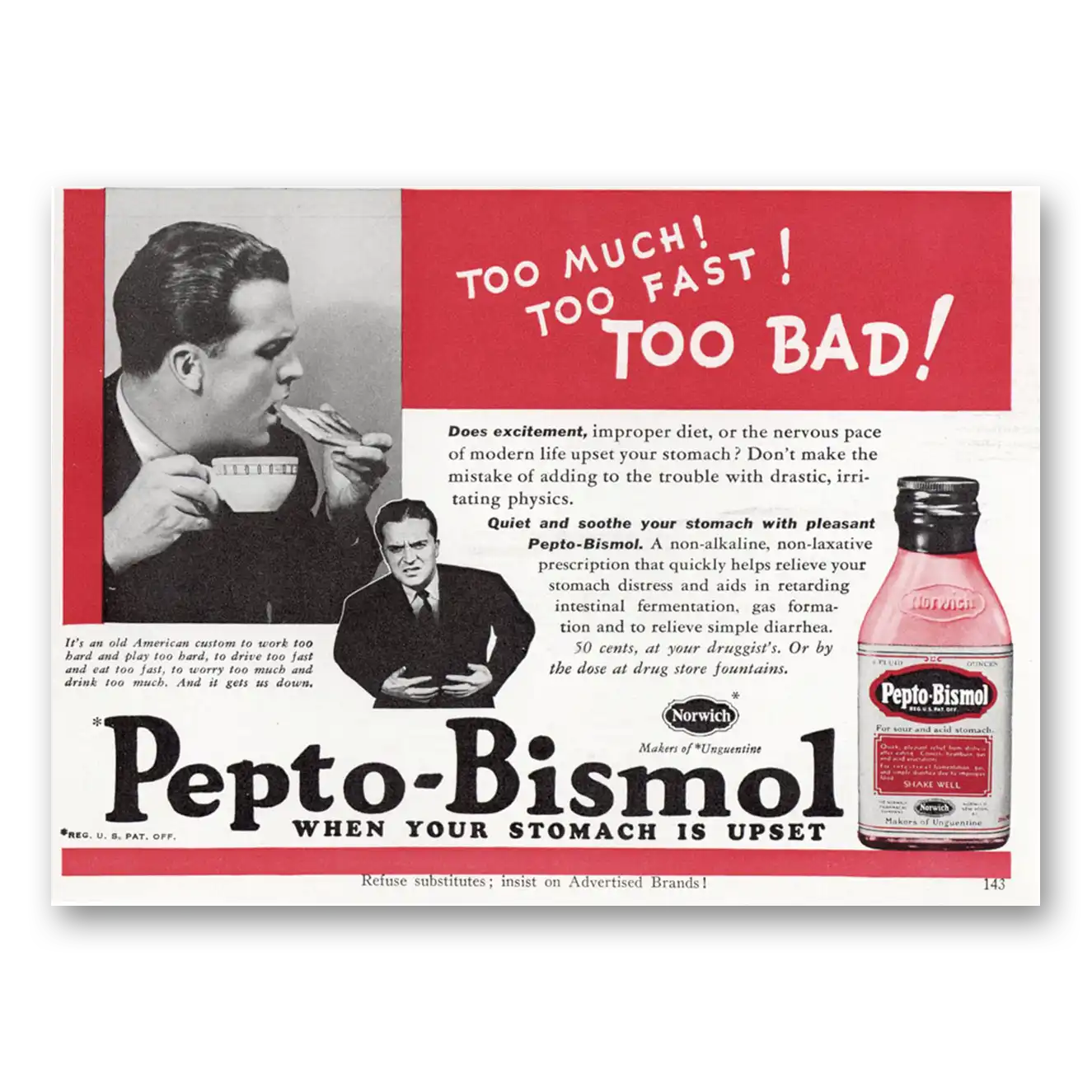 1940 Pepto Bismol Print Ad | Too Much