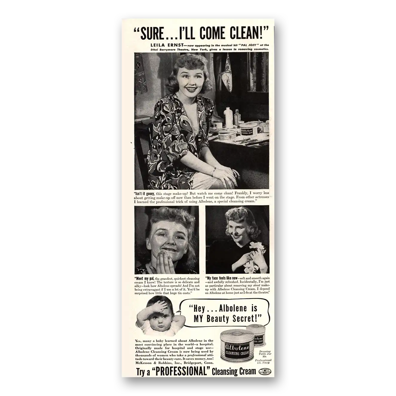 This is an original 1941 Albolene Cleansing Cream print ad published by McKesson & Robbins.