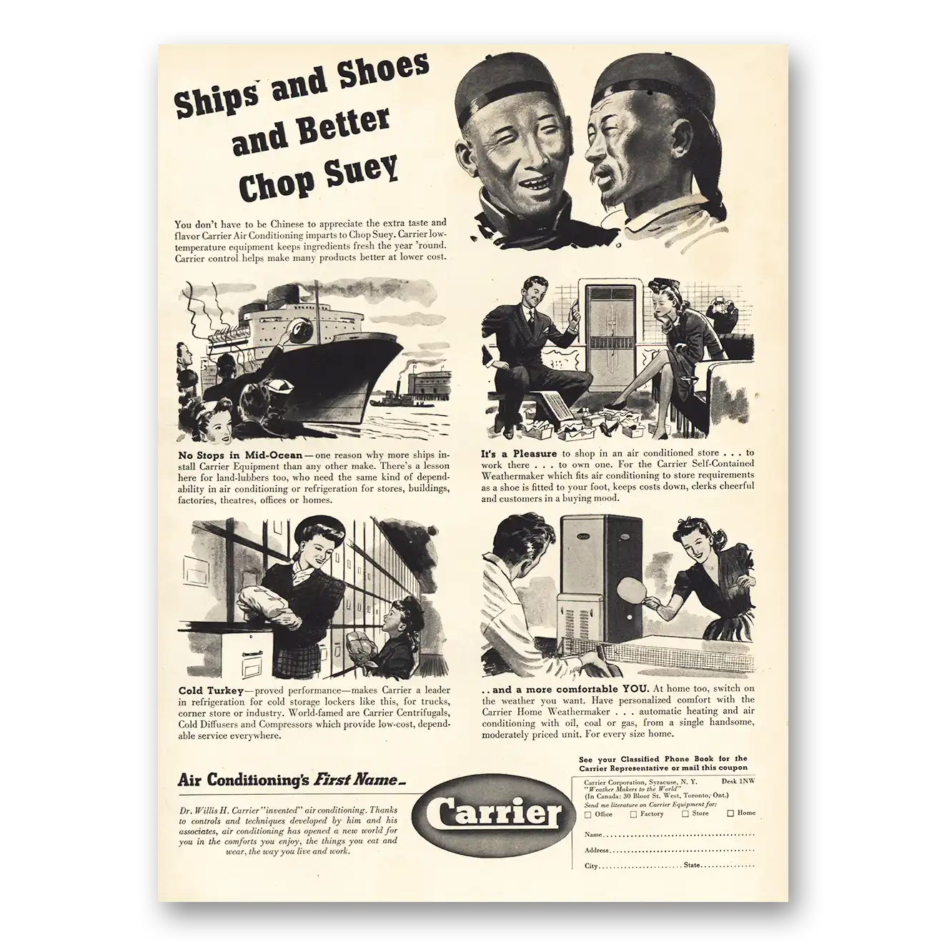 1941 Carrier Air Conditioning Print Ad | Ships Shoes Better Chop Suey