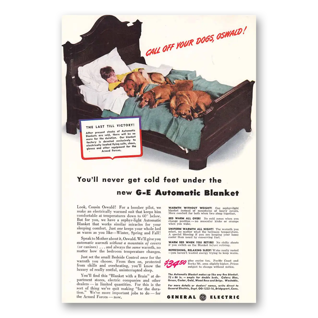 1942 General Electric Blanket Print Ad | Call Off Dogs