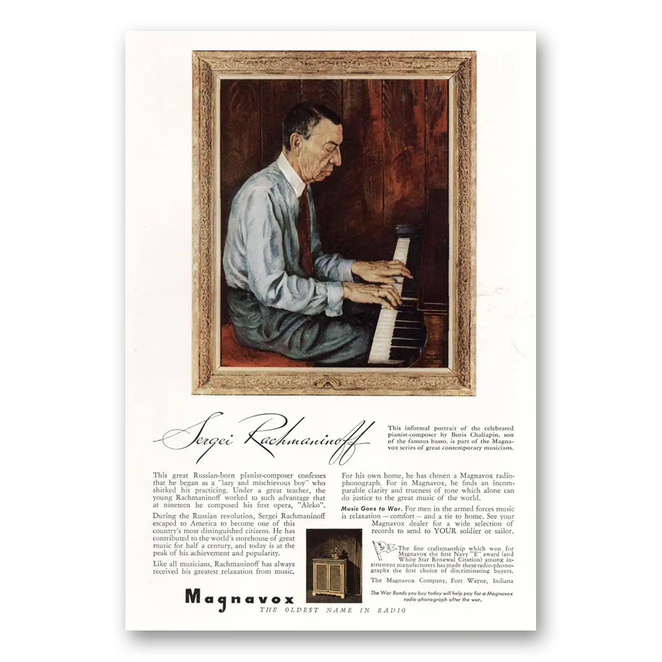 1943 Magnavox Radio Phonograph Print Ad | Sergei Rachmaninoff