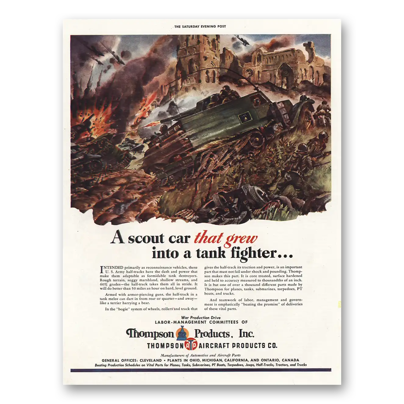 1943 Thompson Aircraft Products Print Ad | Scout Car Grew Into Tank