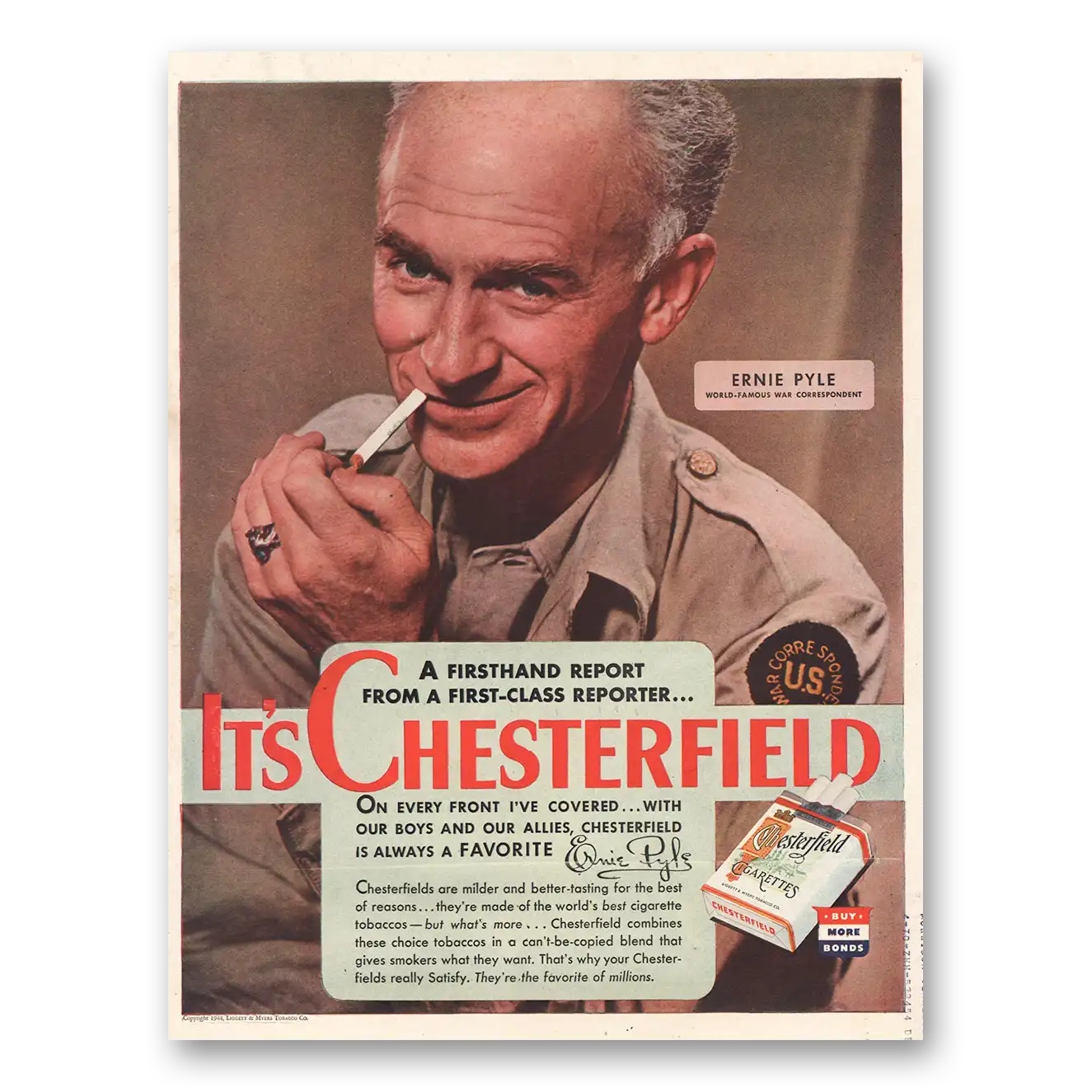 This is an original 1944 Chesterfield Cigarettes print ad published by Chesterfield Cigarettes.