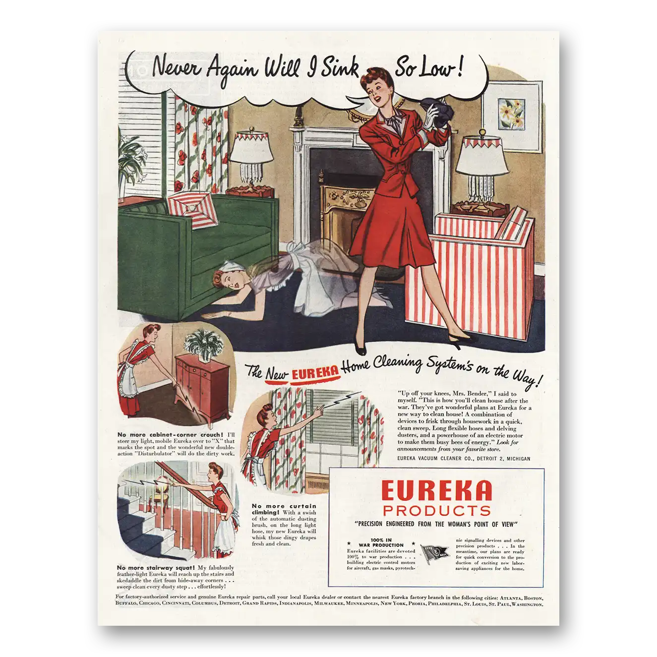 1944 Eureka Home Cleaning System Print Ad | Never Again