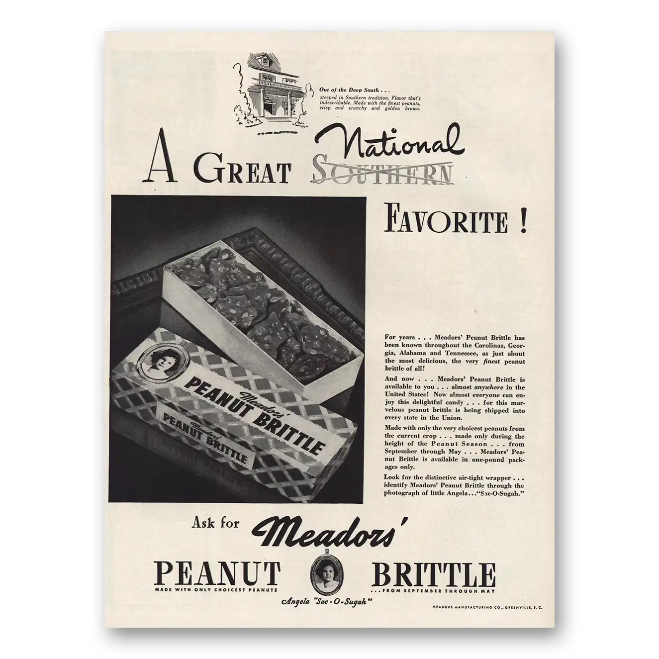1944 Meadors Peanut Brittle Print Ad | Great National Favorite