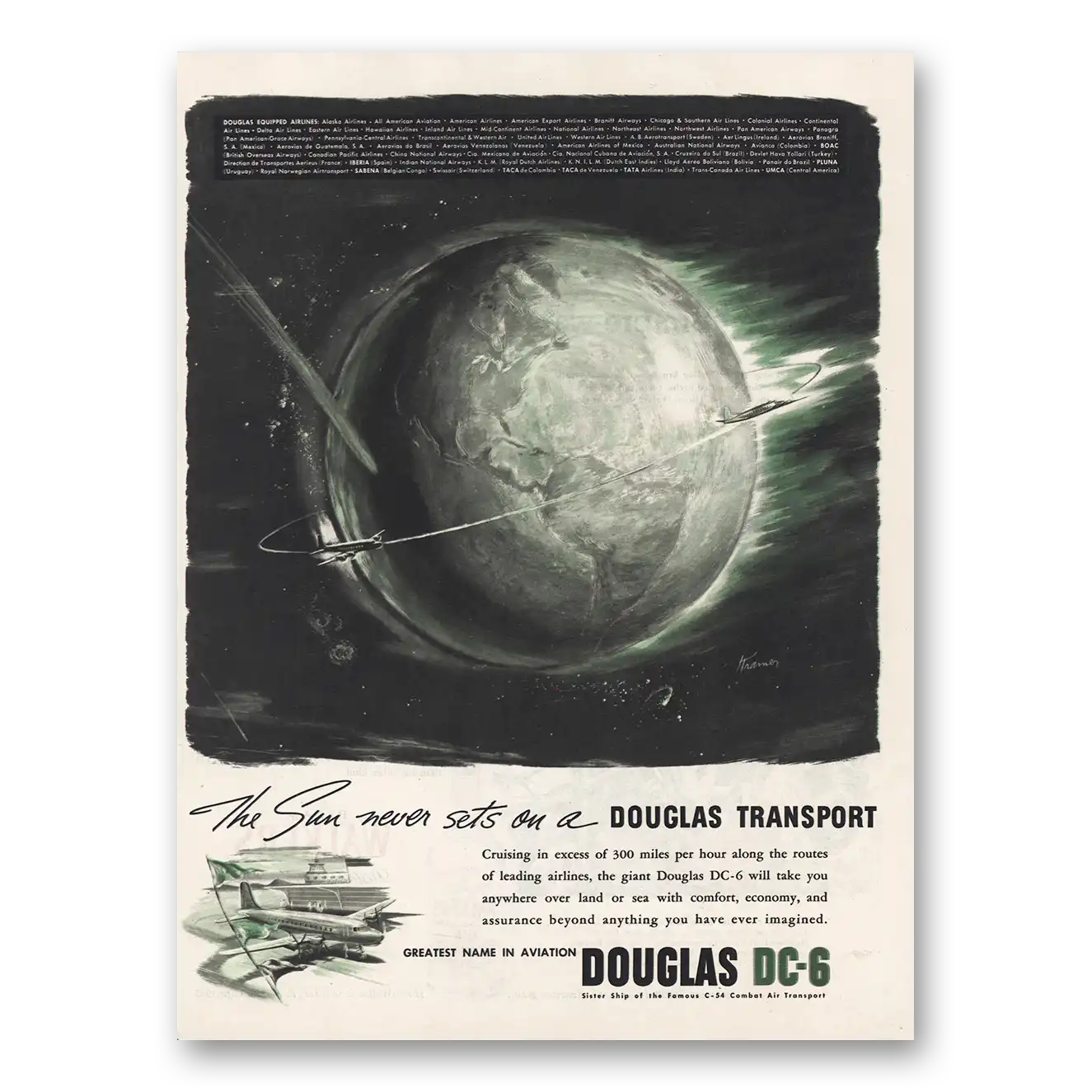 1945 Douglas DC6 Print Ad | Sun Never Sets Lrg