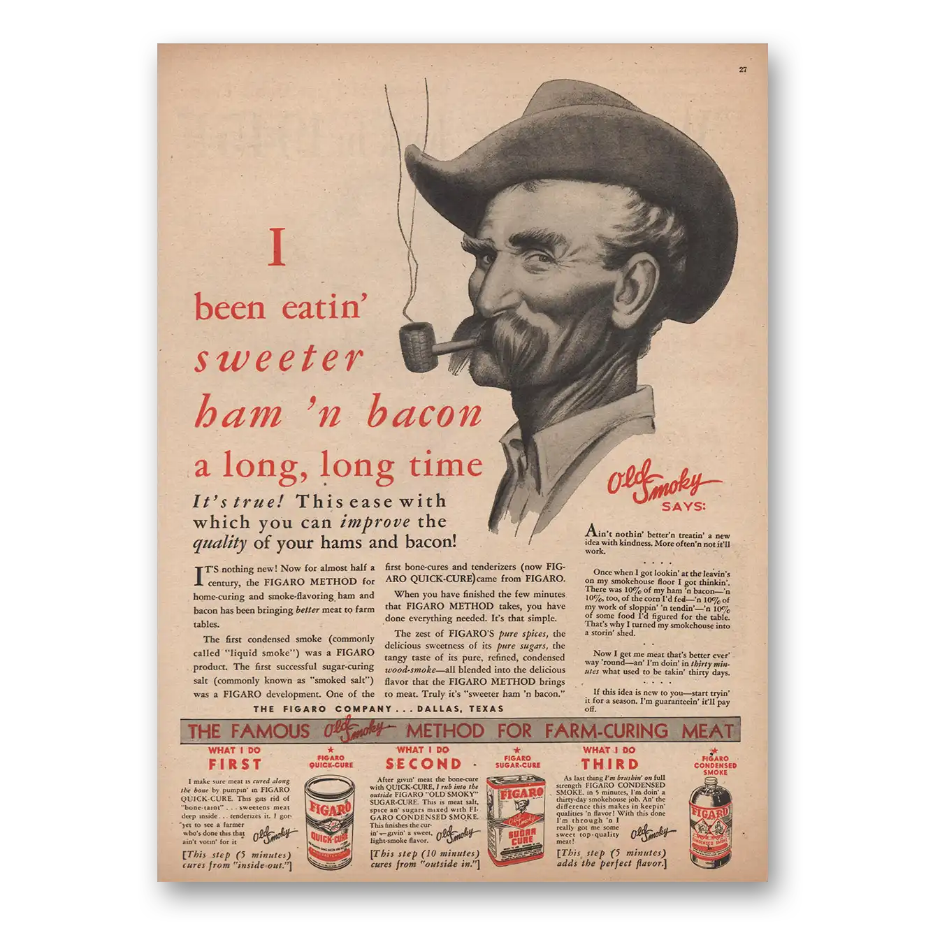 1945 Figaro Company Print Ad | Sweeter Ham Bacon Old Smoky