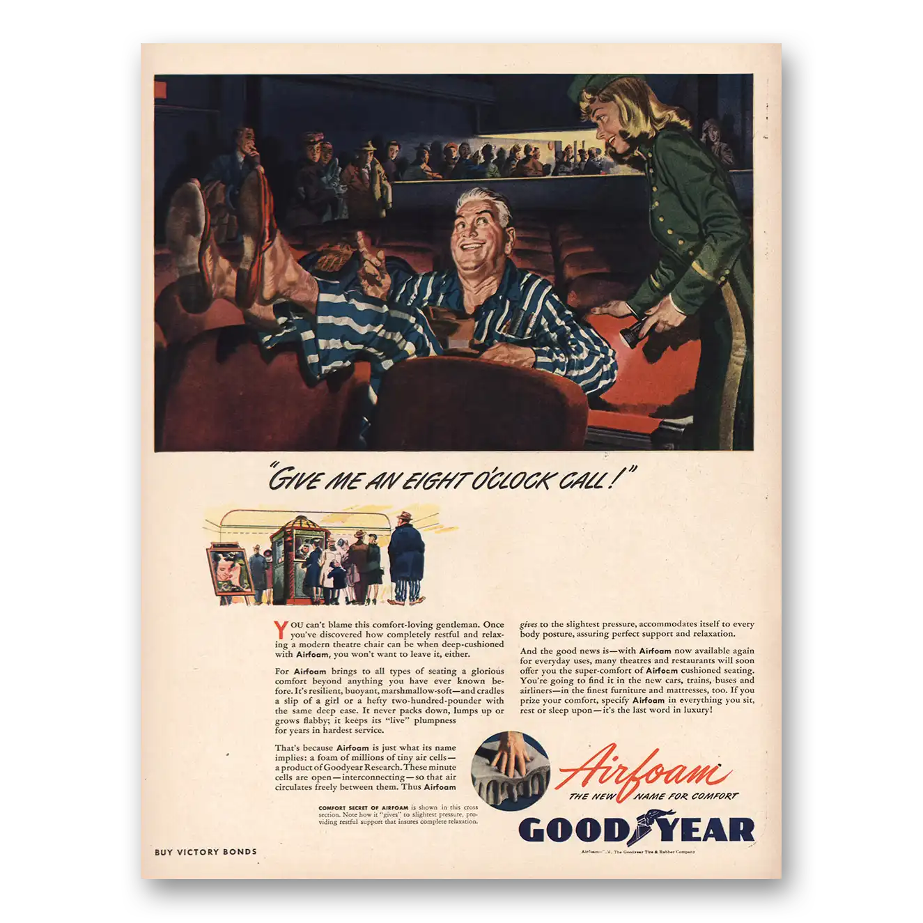 1945 Goodyear Airfoam Print Ad | Give Me Eight Oclock Call