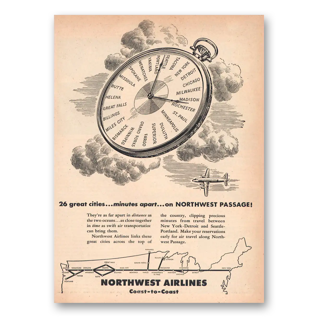 This is an original 1945 Northwest Airlines print ad published by Northwest Airlines.