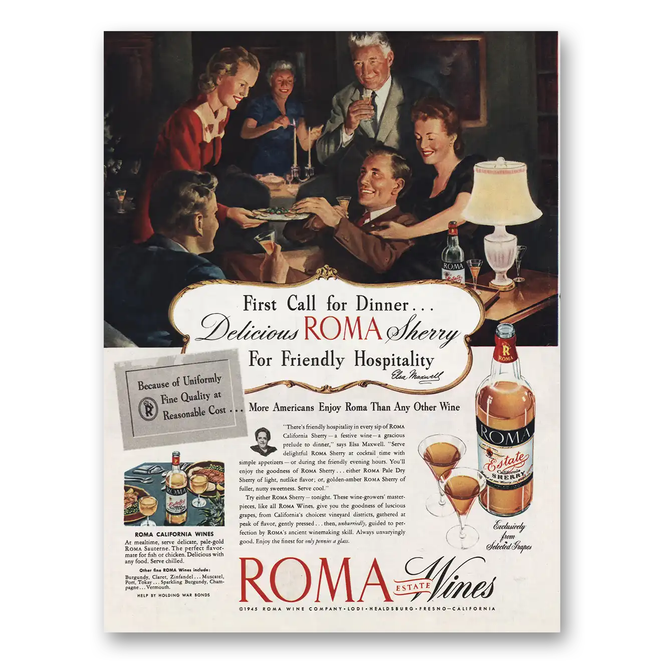 This is an original 1945 Roma Wines print ad published by Roma Wine Company.