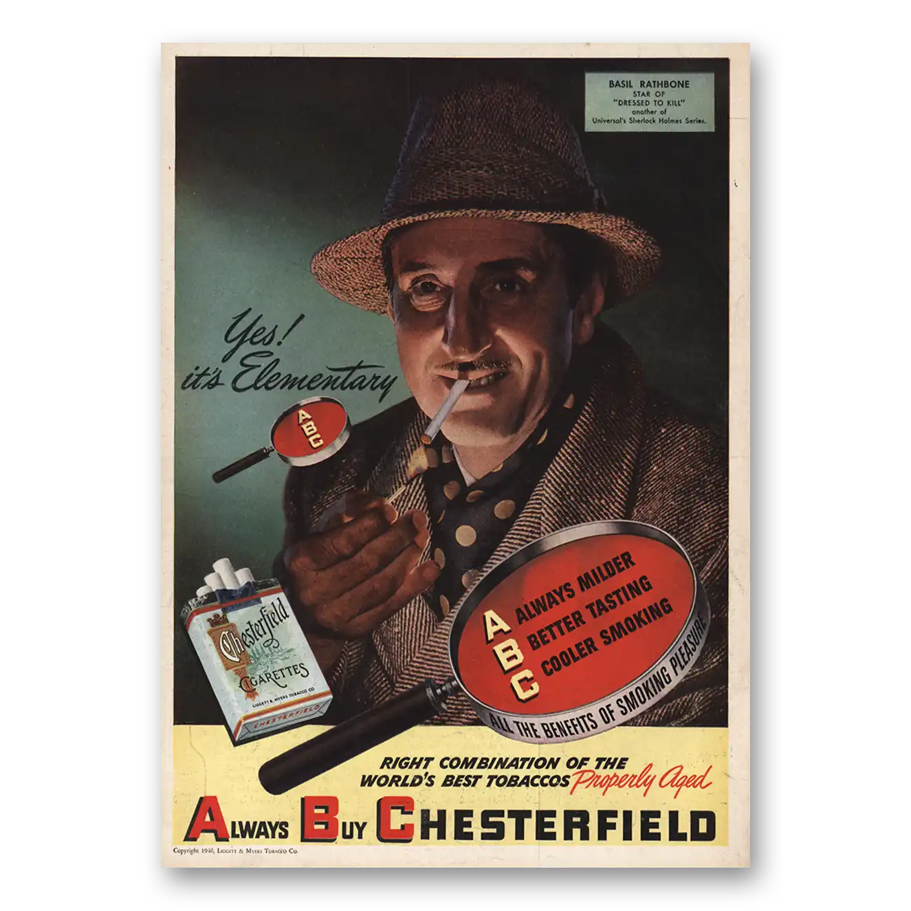 1946 Chesterfield Cigarettes Print Ad | Basil Rathbone