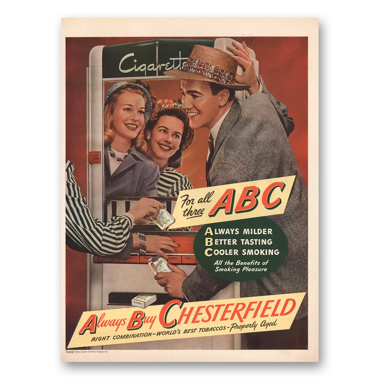 This is an original 1946 Chesterfield Cigarettes print ad published by Liggett and Myers Tobacco.