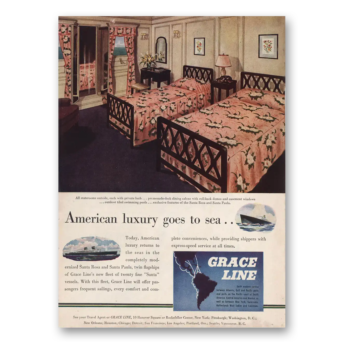 1946 Grace Line Print Ad | Staterooms Outside