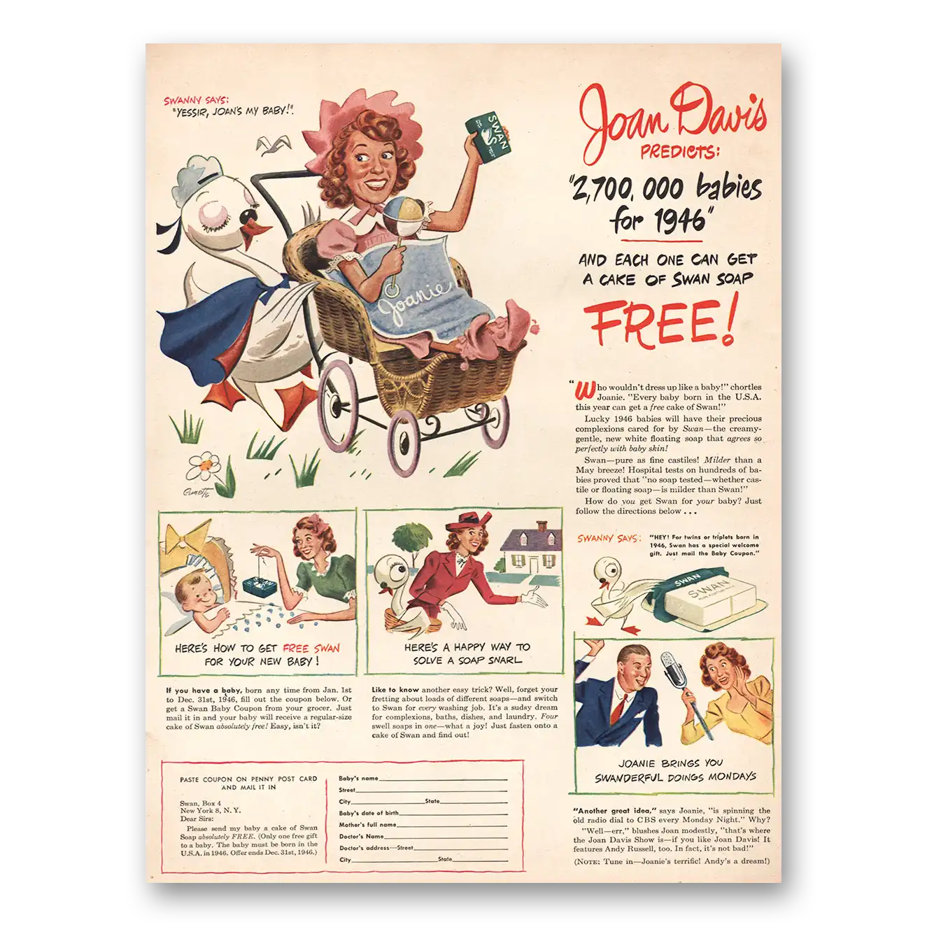 1946 Swan Soap Print Ad | Joan Davis