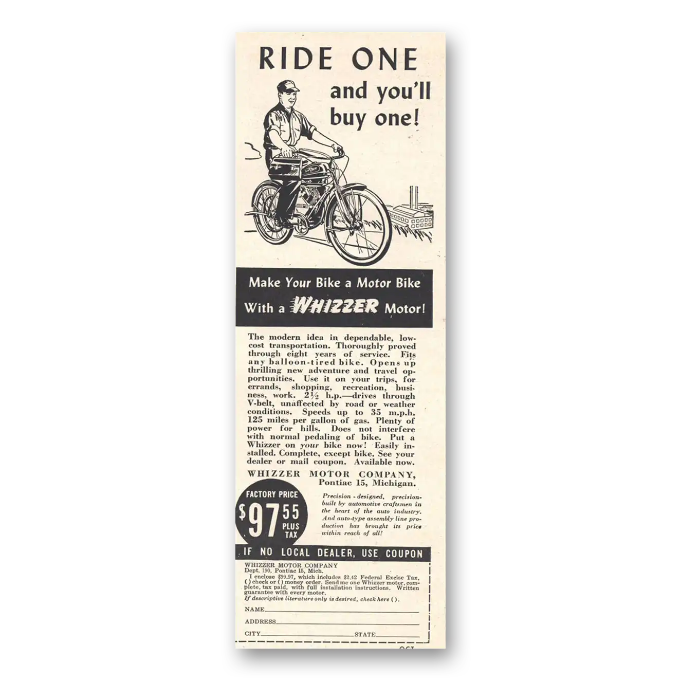 1946 Whizzer Bike Motor Print Ad | Ride One