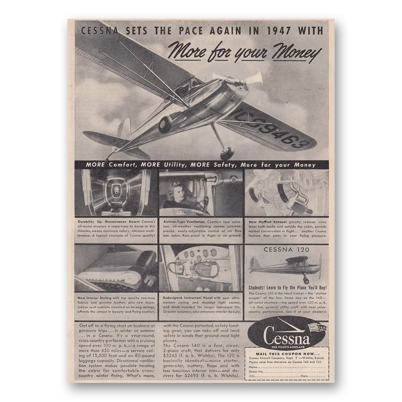 This is an original 1947 Cessna 140 print ad published by Cessna.
