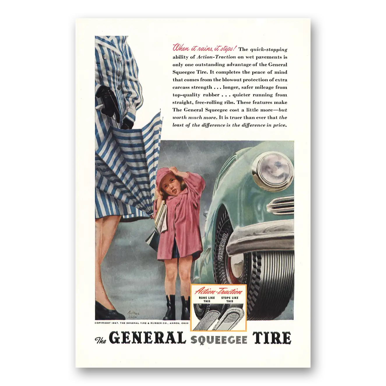 1947 General Squeege Tires Print Ad | When It Rains