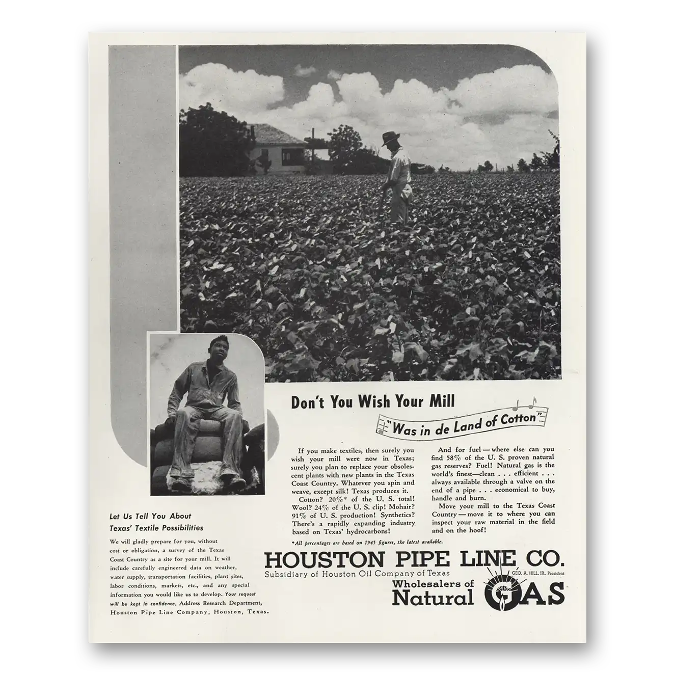 1947 Houston Pipe Line Print Ad | De Land Cotton