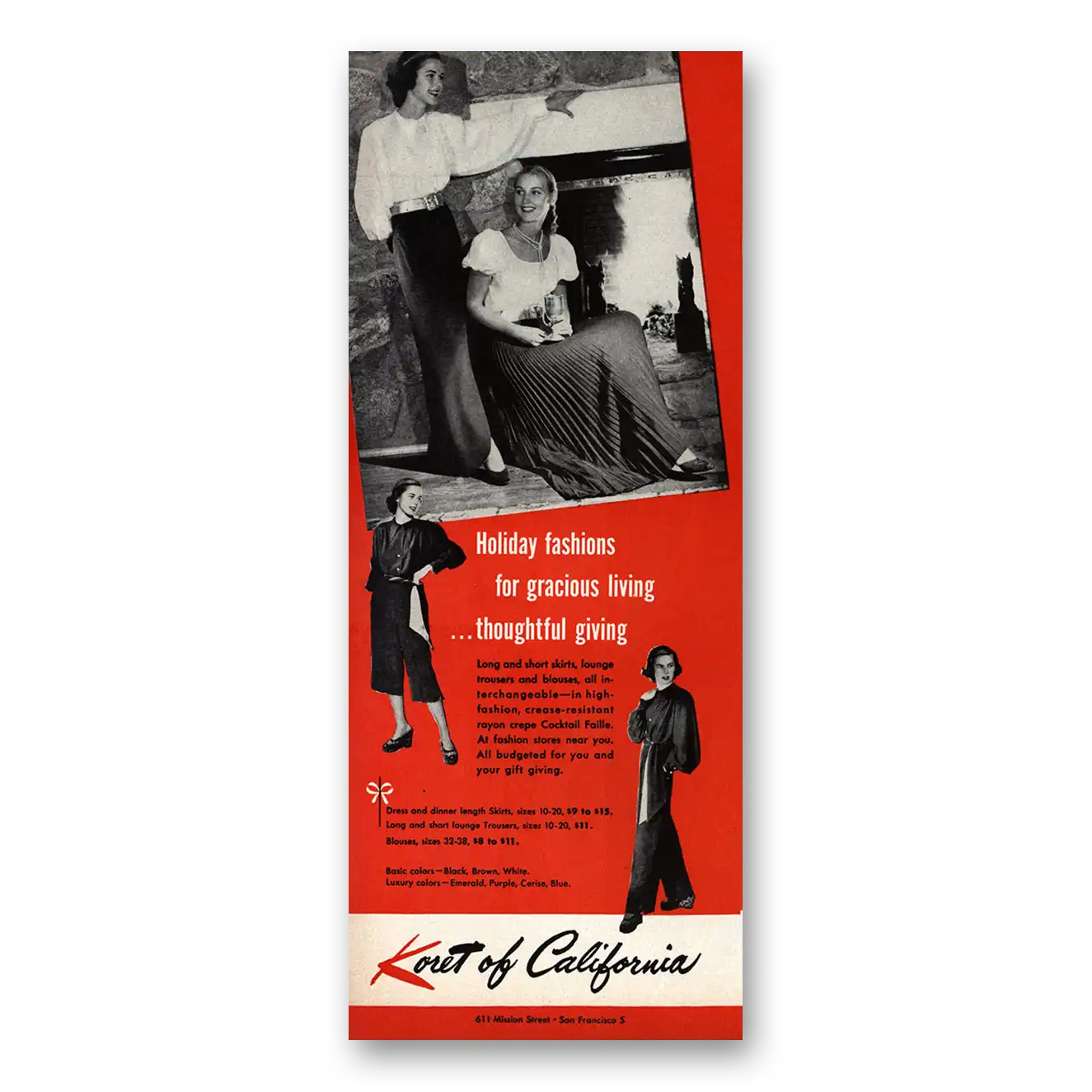 1947 Koret of California Print Ad | Holiday Fashions