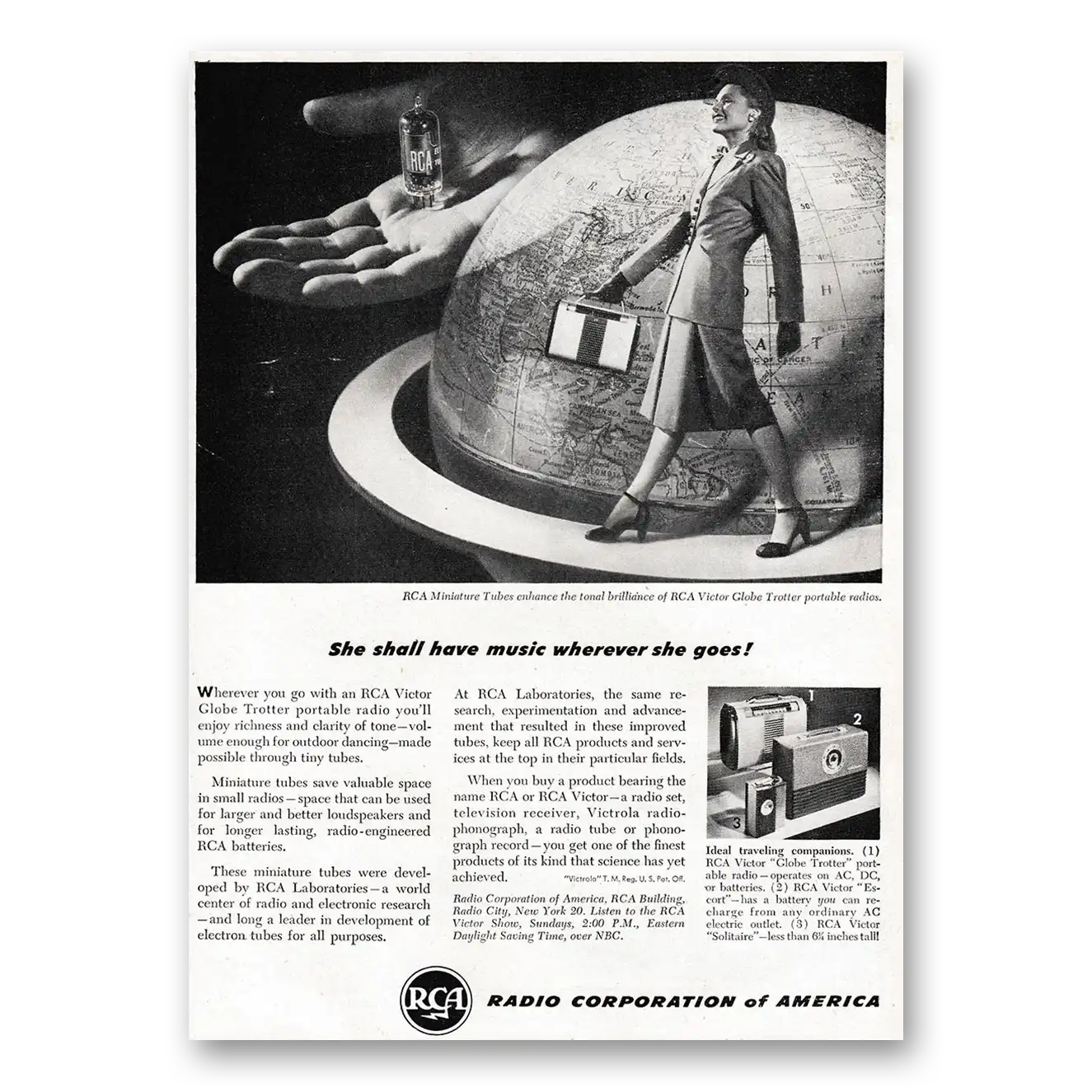 1947 RCA Victor Globe Trotter Portable Radio Print Ad | Wherever She Goes