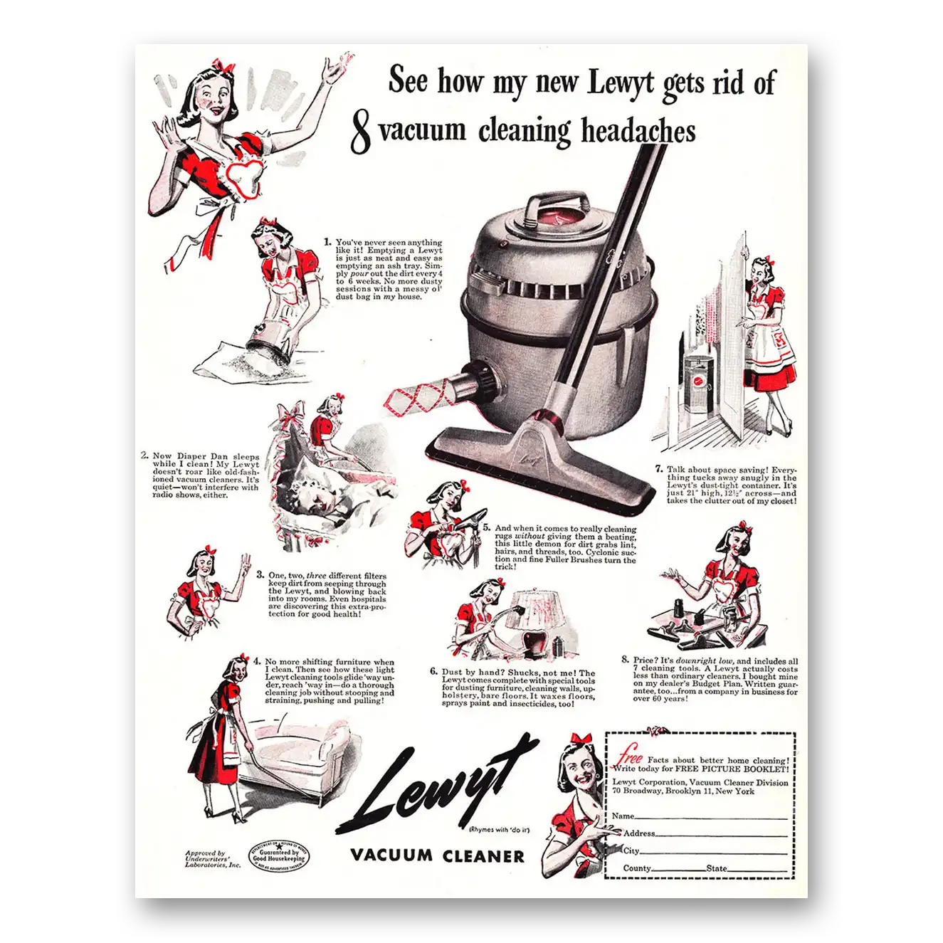 This is an original 1948 Lewyt Vacuum Cleaner print ad published by Lewyt.