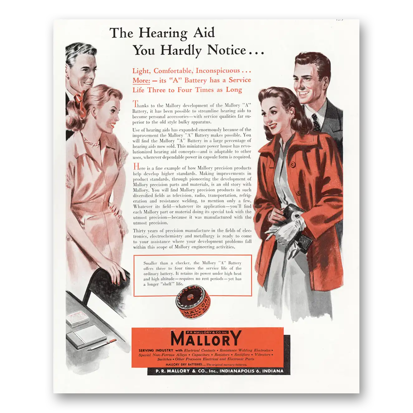 1948 Mallory Hearing Aids Print Ad | Hardly Notice